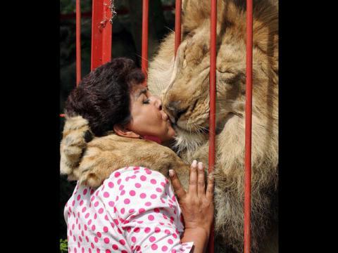 哥倫比亞卡利市一家受虐動物收容中心的一隻獅子丘比特(Jupiter)﹐最近在見到受容照顧它六年的安娜.茱莉亞.托利斯(Ana Julia Torres)時﹐情不自禁地隔著鐵欄杆擁抱及親吻她。