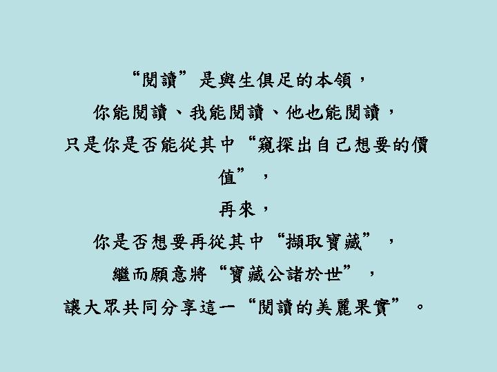 “閱讀”是與生俱足的本領,你能閱讀、我能閱讀、他也能閱讀,只是你是否能從其中“窺探出自己想要的價值”,再來,你是否想要再從其中“擷取寶藏”,繼而願意將“寶藏公諸於世”,讓大眾共同分享這一“閱讀的美麗果實”。