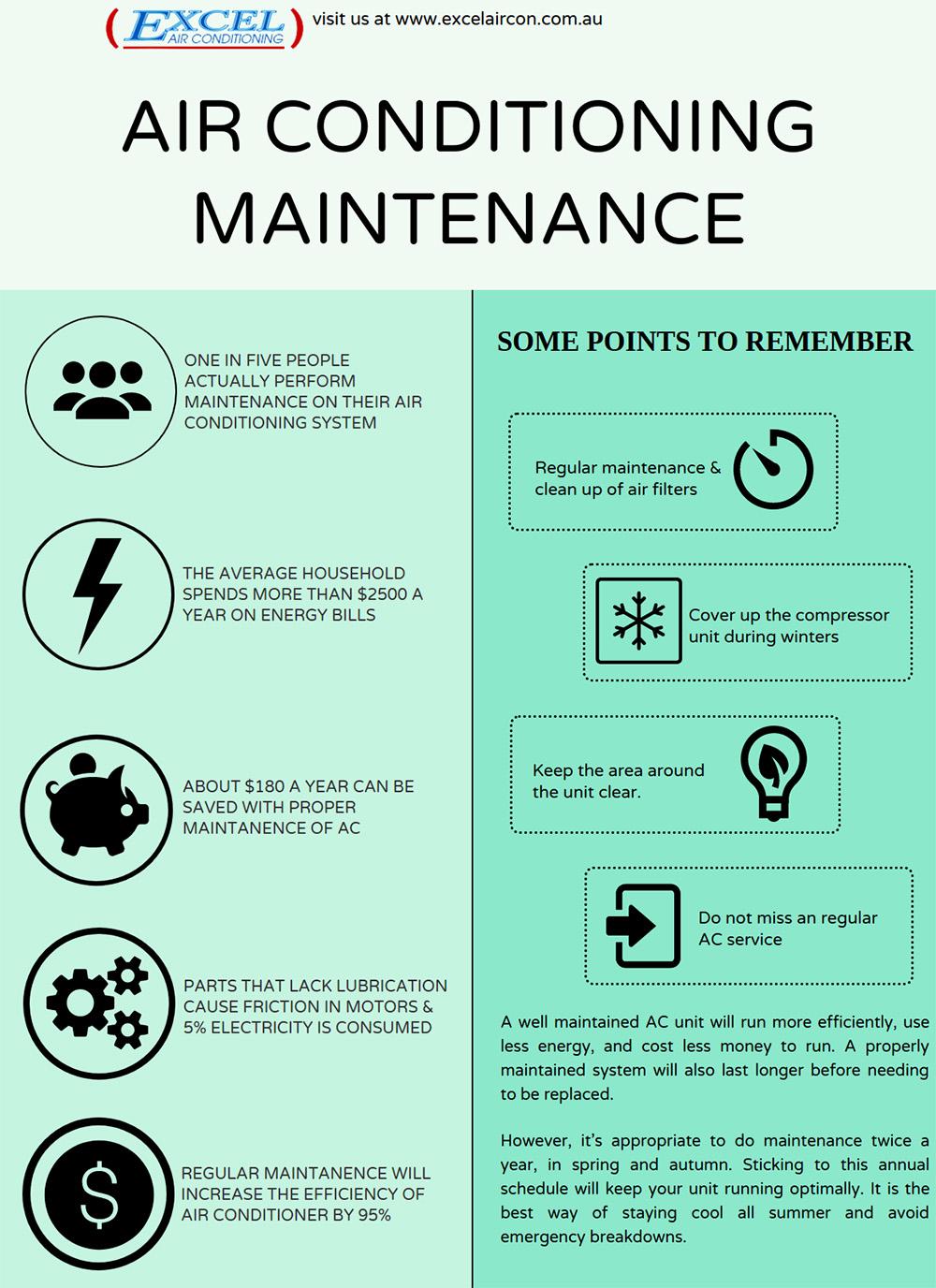 AIR CONDITIONING MAINTENANCE - This infographic is about maintenance of your air conditioning system. The moment performance of your air conditioner drops is because of the one of the common reason, and that usually happens due to lack of maintenance. It is necessary to service your air conditioner twice a year. All essential points of maintenance are explained in this infographic.